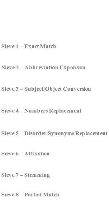 Our adopted approach is simple yet effective for disorder mention normalization. Each sieve in our normalization system corresponds to a unique syntactic string transformation heuristic responsible for converting a mention into one of its equivalent forms in order to match with its stored form in the ontology. A pictorial depiction of the working of our sieve-based system with only a subset of the sieves in our full system is provided below.